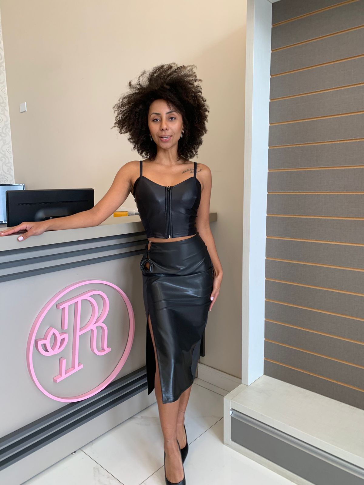 Saia midi com detalhes de argola na lateral da cintura, em cirrê.