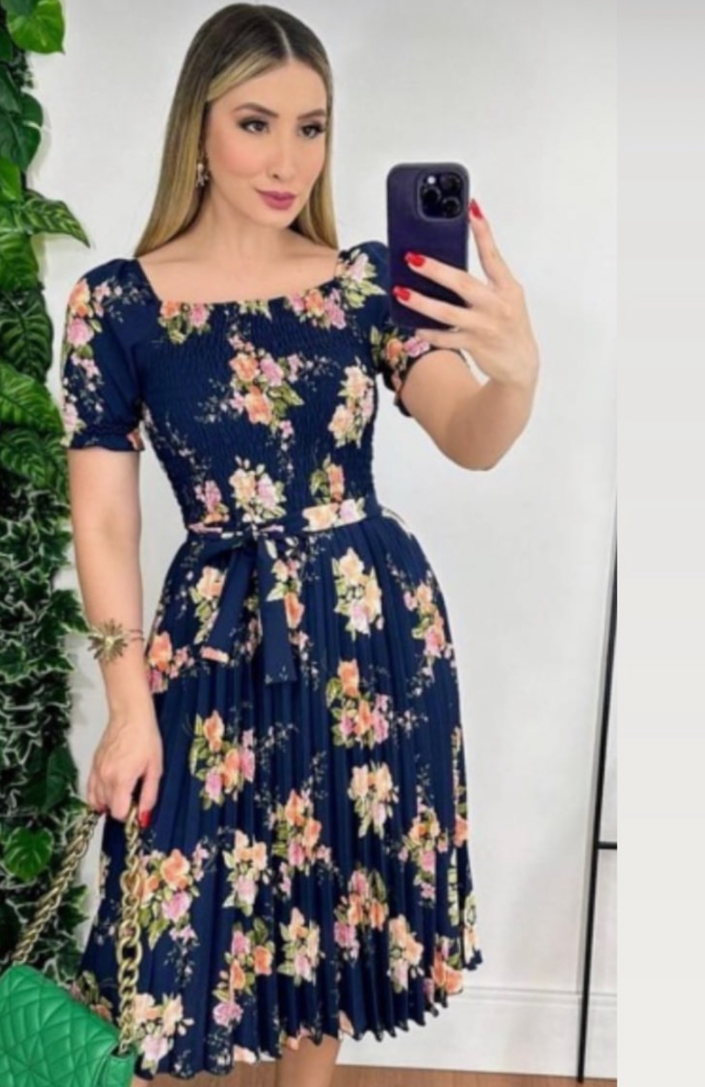 Vestido com detalhes em lastex, manga princesa e saia plissada.